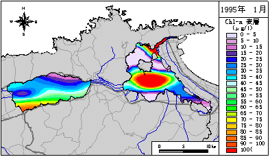 宍道湖・中海のクロロフィルaの水平分布(1995年)